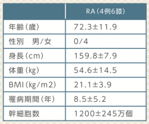 この調査では、リウマチと膝関節症を併発している方(以下、リウマチのグループ)と、変形性膝関節症を単体で発症した方(以下、変形性膝関節症のグループ)に分け、培養幹細胞治療から6ヶ月間の効果を追跡調査しました。リウマチのグループは症例数が多くないため、症例数の多い変形性膝関節症のグループと比較し、どのような違いがあるのかを確認する意図があります。
